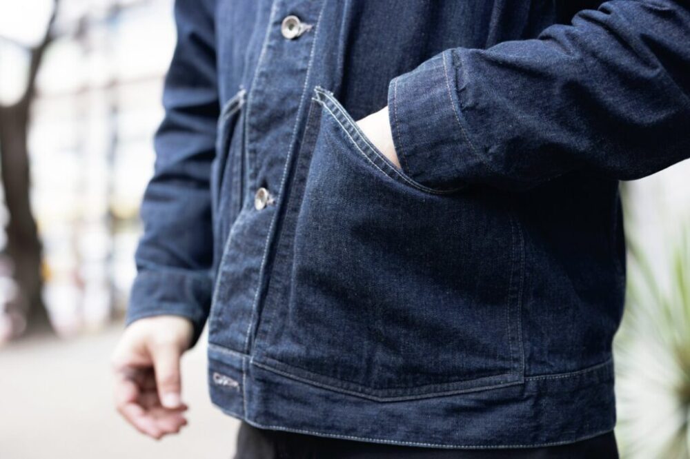 「普段、Gジャンを着用していることもあり、一般的なカバーオールの丈だとパンツとのバランスが取りづらいという見た目的な理由と、バイクで通勤しているのでショート丈の方がバタつかず、座って作業することも多いため、これくらいシンプルな方が使い勝手がよいと思ったんです。モノが入れやすいようにポケットの入れ口を斜めにしました。身頃に宿る絶妙なゆとりで動きやすさを確保し、重ね着にも対応してくれます」