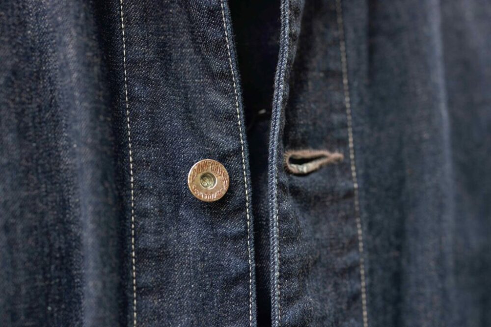 あえて鉄製のオリジナルドーナツボタンを使っているので、ほどよく錆びてきており、エイジングを楽しめる。緯糸にグレーを使っているので、エイジングも深みがある。