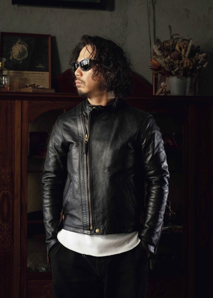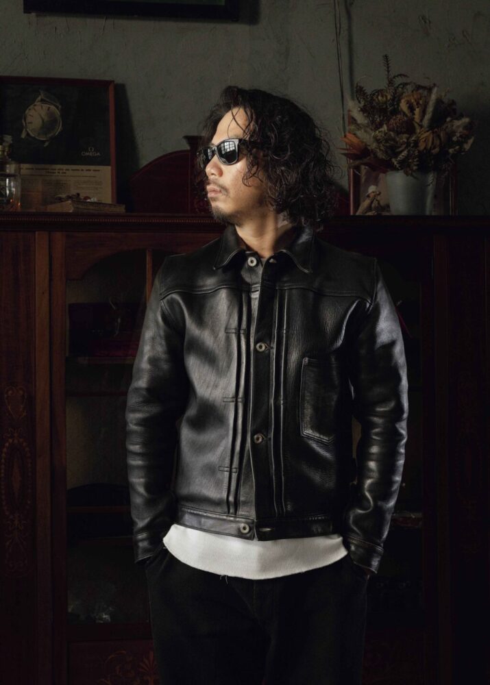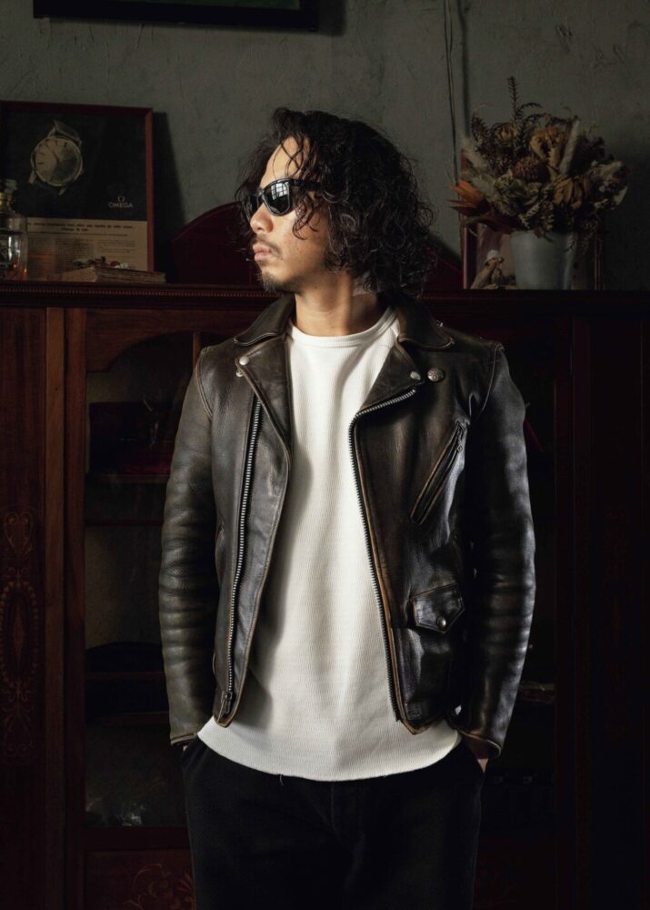 王道のダブルライダースをベースに、1950〜’70年代のディテールをミックスさせ、理想のライダースを構築した「レオン」。こちらは、エポレットとベルトを“あえて”ぶった切ったカスタムモデル。1.8㎜厚のフルベジタブルタンニン鞣しの馬革を、まず芯通しで茶の水性染料で染め、その後に芯まで染めないよう、黒の水性染料で丸染している。着込むほどに、ヴィンテージのようにうっすらと“面”で茶芯が出現してくる。206,800円