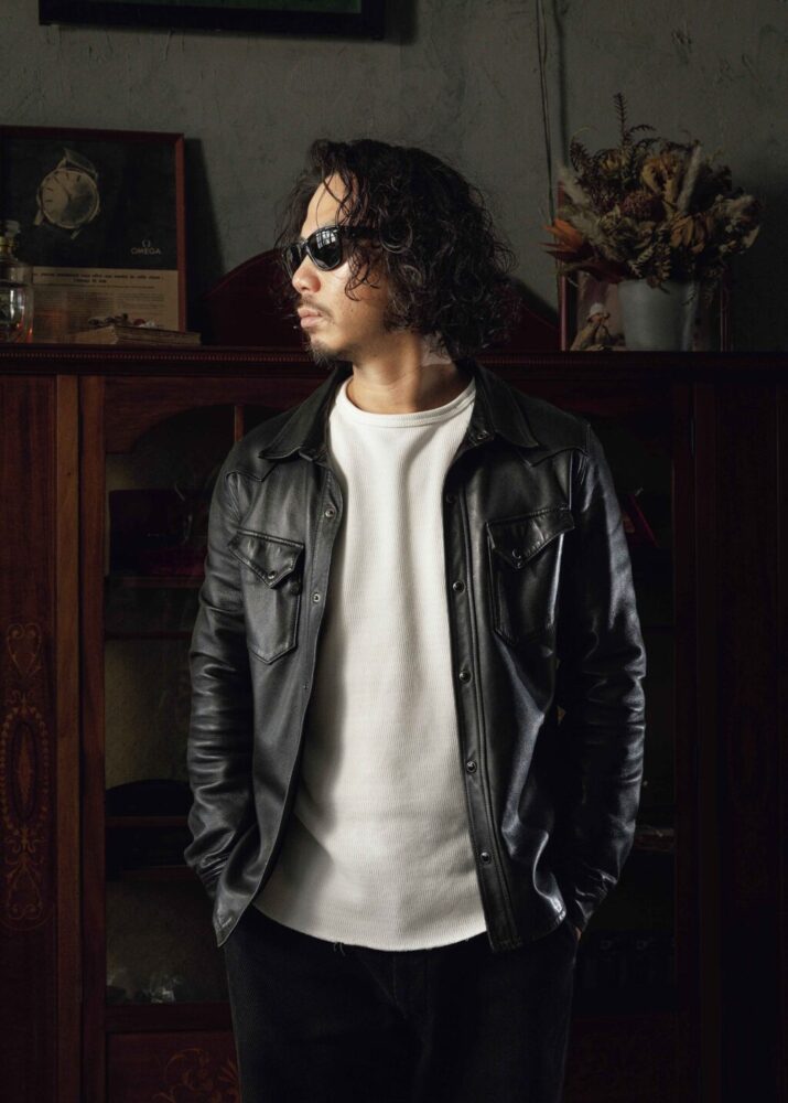 アンボイの今西さんのトレードマークというべきレザーウエアが、こちらの「ハンク」。1㎜厚のシープスキンを採用した、ウエスタン仕様のレザーシャツだ。革ジャンに比べるとちょっと存在感の薄いレザーシャツだが、春や秋にも着ることが出来、コーデの幅を広げてくれるスグレモノだ。染料染めの素上げで仕上げているため、ダイレクトなエイジングが楽しめるのもハンクの魅力。あなたのレザーコーデに一着いかが? 132,000円