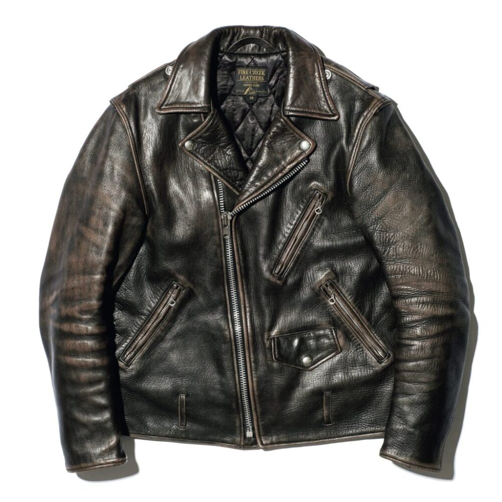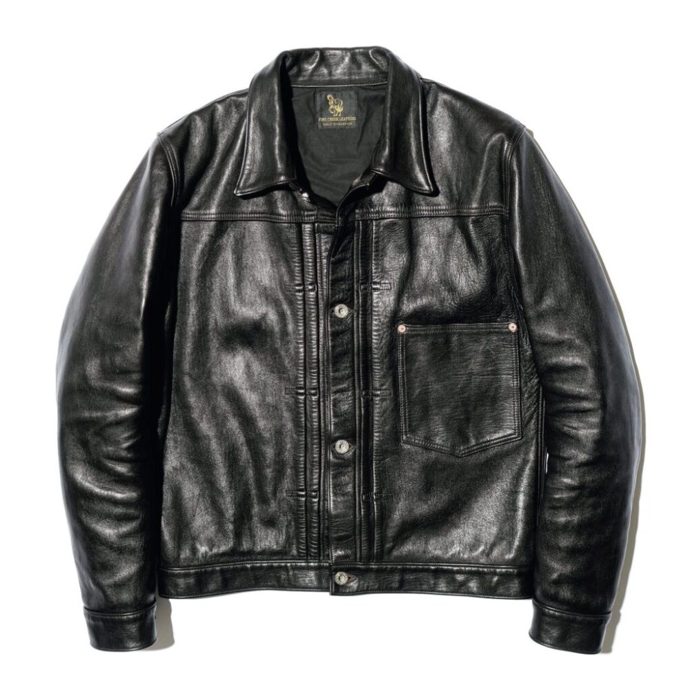 ファインクリークレザーズを代表する「Gジャンタイプ」の真打ちとも言えるモデル。往年の大戦モデルをベースとしており、月桂樹ボタンやシンチバックなど、細部の意匠はヴィンテージファンも納得の仕上がり。1.8㎜の素上げの渋鞣しの馬革をベースにオイルを足し、特有のしっとり感を実現、仕上げで光沢感をプラスさせている。バックスタイルは、古着好き垂涎のTバック仕様となっているのも見逃せない。203,500円