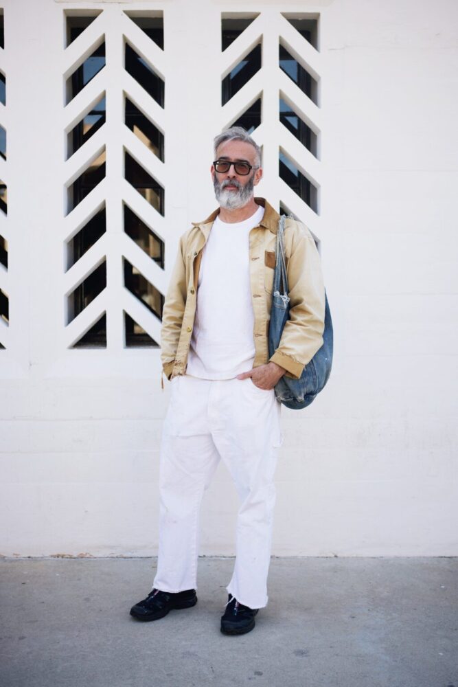 1980sカーハートのワークコートはいま、世界中で高騰しているネオ・ヴィンテージ。白パン+白Tに2トーンのアウターという、とても考えられているのか、ナリユキなのか判断が付かないくらいのナチュラルコーディネイト。「若い頃からずっと着ているんだぜ」とは言わなかったが、そう感じさせてしまう馴染みまくりの着こなしは中年男性の鑑。