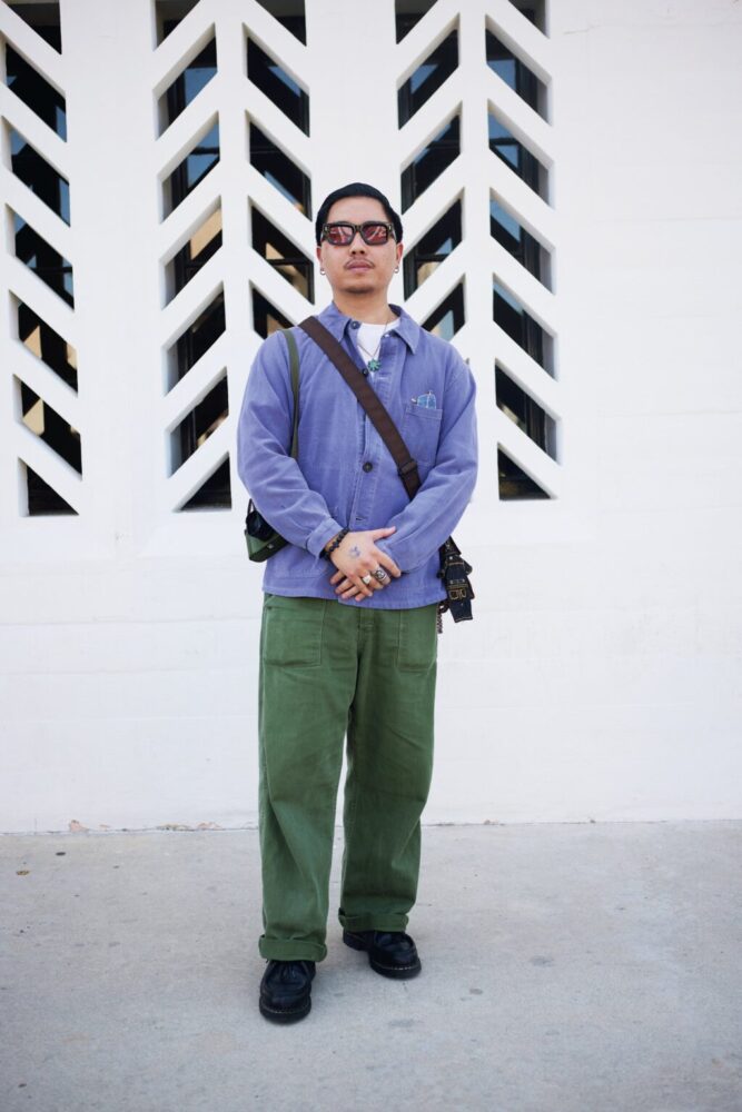 西海岸屈指のヴィンテージイベントにお宝を探しに来るだけあって、着用していたカバーオールも超お宝級。胸のポケットが簡略化されたいわゆる大戦モデル。チノパン+白Tにラフに腕まくりした、シンプルコーディネイトが勝手に選んだベストドレッサー。見事なコーディネイトだ。袖口の緩いカバーオールは腕まくり&バングルなんだね!