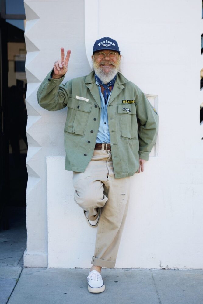 アメリカヴィンテージ界の重鎮であるダグさんは、ご存知Double RLのヴィンテージ部門。重鎮なのにピースサインで陽気に応じてくれるところが、彼のカッコいいところだ。コーディネイトも溜息が出るほどの素晴らしさ。我々がどうのこうの言える相手ではありません。細部までよーく見て真似してみてはいかが。笑顔とピースも真似しましょう。