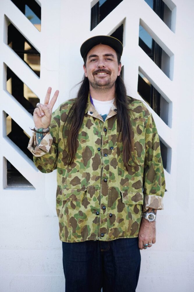 アメリカ・ヴィンテージディーラー界の若手注目株。1942年採用のアメリカ海兵隊のdダックハンターカモを平和に着用。太い袖口のもたつきをロールアップで解消しつつ、リバーシブル面の迷彩をチラ見せ。両面カモのM-1942はどうしてもコレをやりたくなってしまう気持ち、わかる。腕まくりには時計とアクセサリー。これが鉄板。