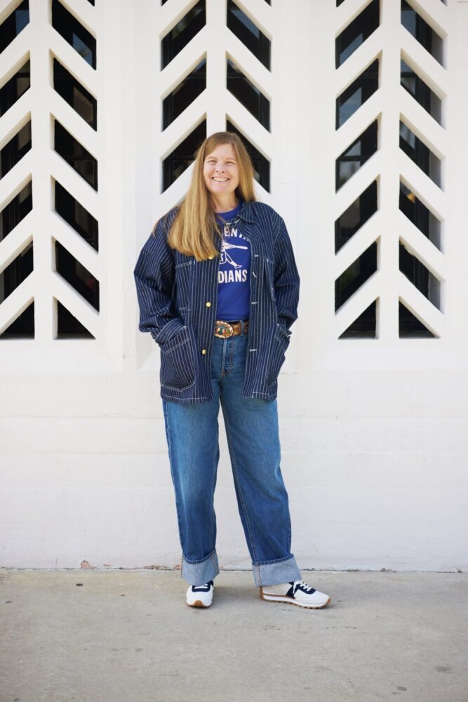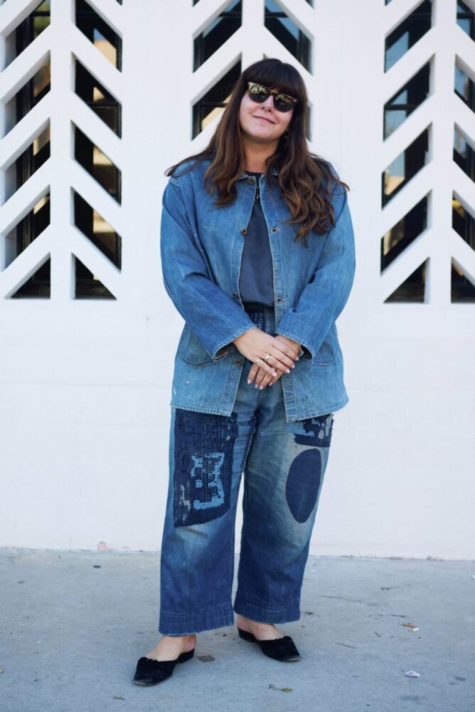上のジャスティンと一緒にヴィンテージディーラー業を営むサラ。着ているのはゴリゴリの大戦モデルのチョアジャケット(編集長・松島、購入を試みるも金額で断念……)。パッチワークデニムでインディゴの濃淡を上手に表現しているあたり、さすがヴィンテージプロフェッショナル。フェミニンな足元もステキ。