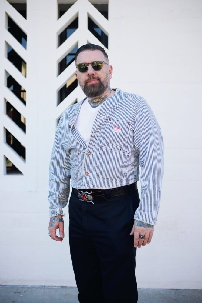 明らかにカットオフしたエンジニアジャケット。個性の強い人だなぁと思ったら、人気ミュージシャンだった。F難度のカスタムをサラリとこなす上級カバーオーラーだ。想像するに、自身のタトゥー込みでコーディネイトを考えているのでは? 短丈ジャケットを着たら、ベルトに存在感を持たせるといいのか! 自由奔放、ゴーイングマイウェイ。