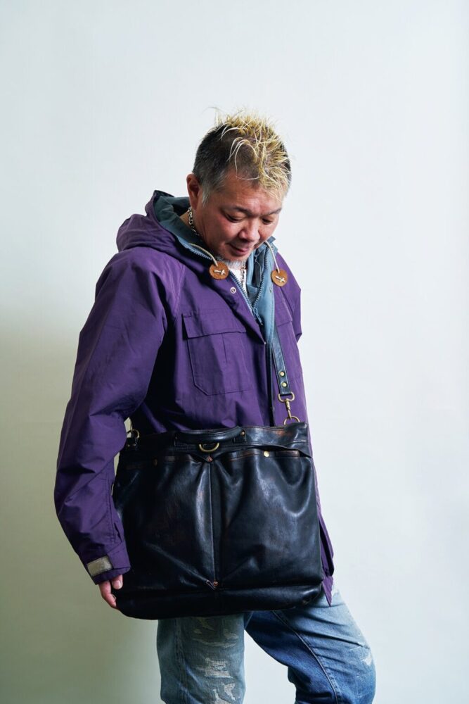 普段のモヒカン小川の装いからはイメージできない、クラシックアウトドアなマウンテンパーカを合わせたスタイリング。アウトドアやスポーティな印象の強いロクヨンクロスに重厚感のヘルメットバッグを合わせることでコーディネイト全体が引き締まっている。