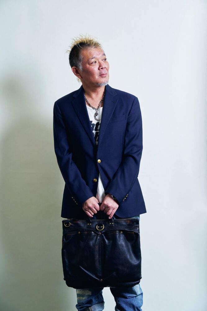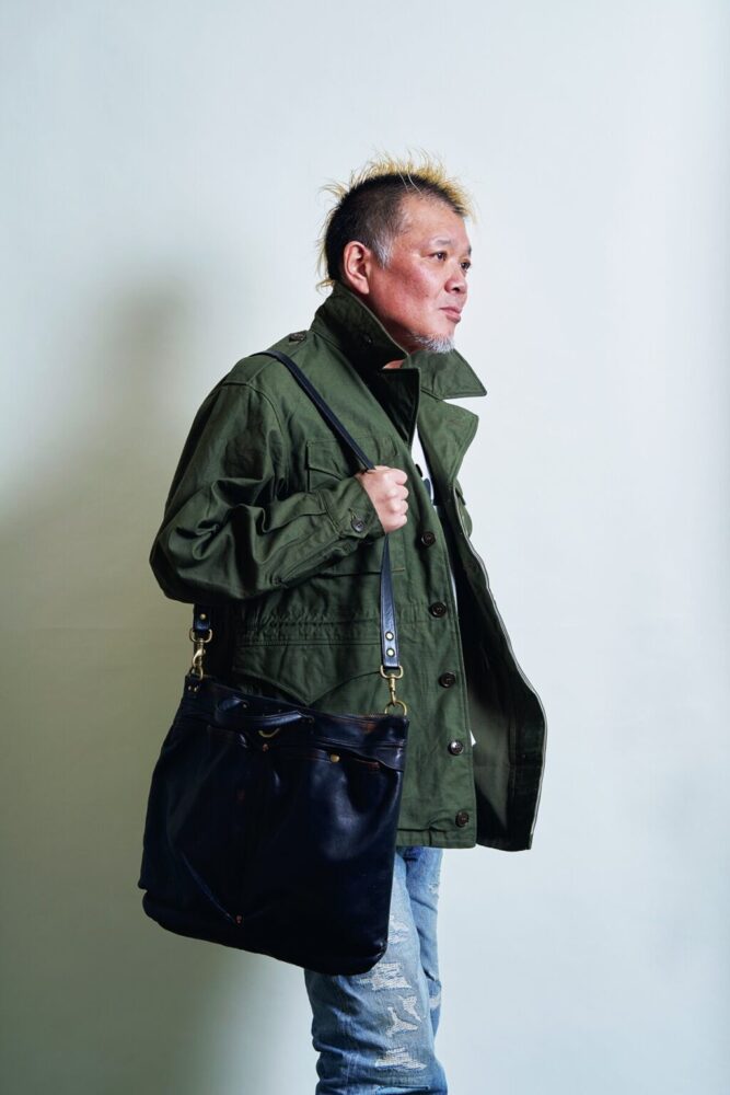 年中革ジャン(夏は革ベスト)を着用しているモヒカン小川。今回は茶芯ヘルメットバッグの汎用性の高さをみていただくために、ミリタリー、トラッド、アウトドアの3つのスタイルを試してみた。