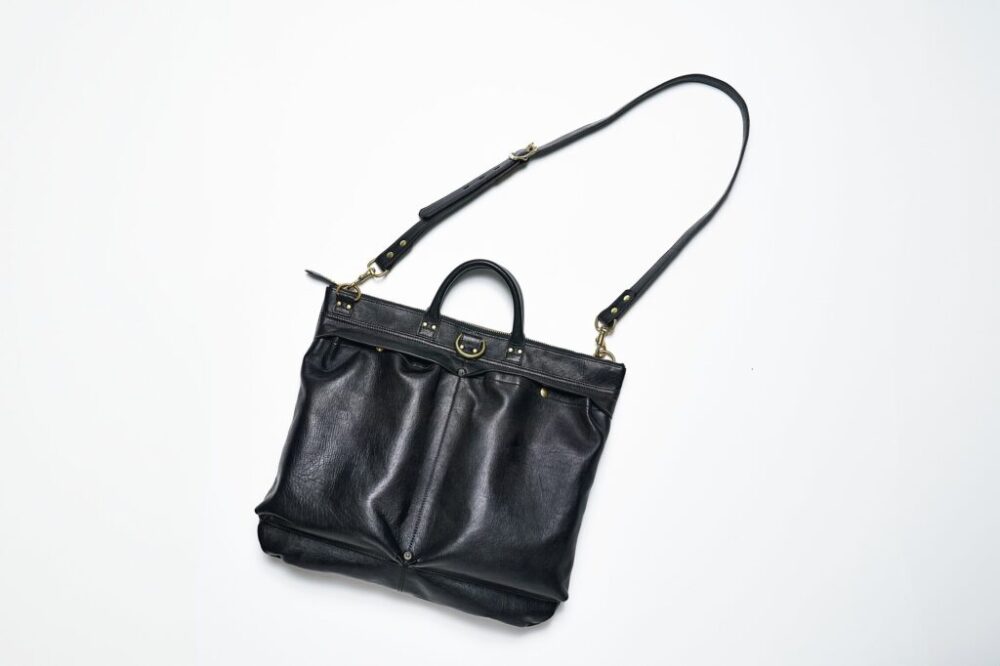 純国産のホースハイドを使用したヘルメットバッグ。使い込むほどに下地の茶が浮かび上がるレザーラバーにはたまらないエイジングを楽しむことができる。ミリタリー由来のヘルメットバッグは王道のアメカジスタイルと相性抜群。金属パーツは真鍮製、ショルダーベルトが付くなど、細部へのこだわりも◎。93,500円