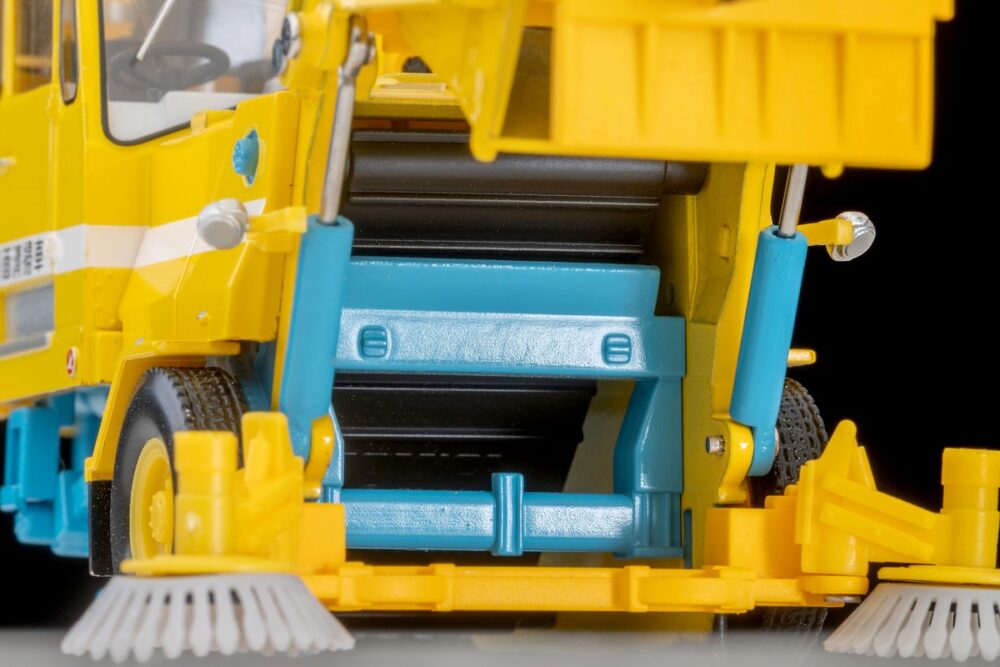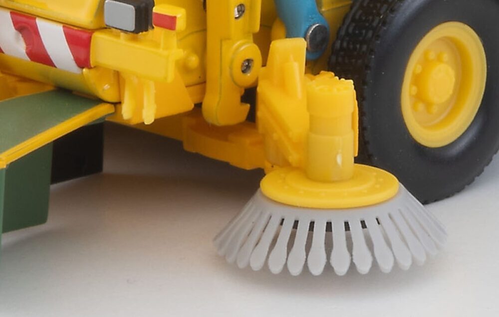 バケット部分や各所のブラシなど、車両の特徴となるポイントは可動式とし、「トミカリミテッド ヴィンテージ」シリーズ最多の可動ギミック数を実現。さらに、小回りを利かせるため逆ハの字になっている後輪には、シリーズ初となるステアリング機構を搭載している。