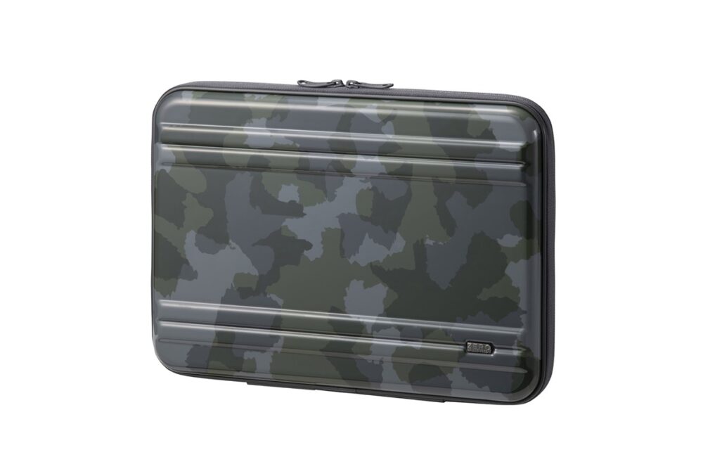 耐久性に優れたポリカーボネート製のPCケース。移動の多いビジネスシーンに適し、内部には伸縮性のあるメッシュ仕切りを備え、USBメモリやモバイルWi-Fiなどのアクセサリーもスマートに収納できる。