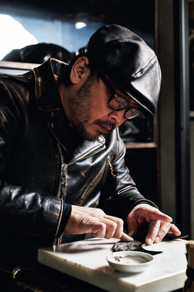 歴史上のレザープロダクツを解析して再現するのではなく、自身の原体験から生み出すクリエイティブなモノ作りがジ・オーアの根源となっているわけだ。レザーカービングと日本画からヒントを得た着色技法、それぞれジャンルの異なるオールドスクールが重なり合って、新たなオリジナリティを生み出す匠の技。そして、それはレザーや鉱石の天然素材特有の経年変化を見越したプロダクトである。着用者のライフスタイルと共にレザーと燻銀が織りなす色気を引き出す、侘び寂びの美学が宿る唯一無二のレザーなのだ。