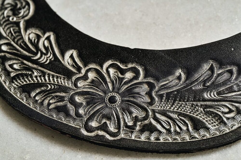 ジ・オーアは、レザーの伝統的な装飾技法であるレザーカービングに、日本画の岩絵具から着想を得た天然の鉱石を密着させて着色する、アツレザーワークス独自の装飾技法だ。カービングの彫りに色がのり、コントラスが浮き上がるため、ベースとなるカービング技術の高さがあってこそ成立する技である。そして、純銀は外気に触れゆっくりと硫化するため、着込むほどにレザーと同時にそれぞれのエイジングが進み、着用者だけの表情に変化する。