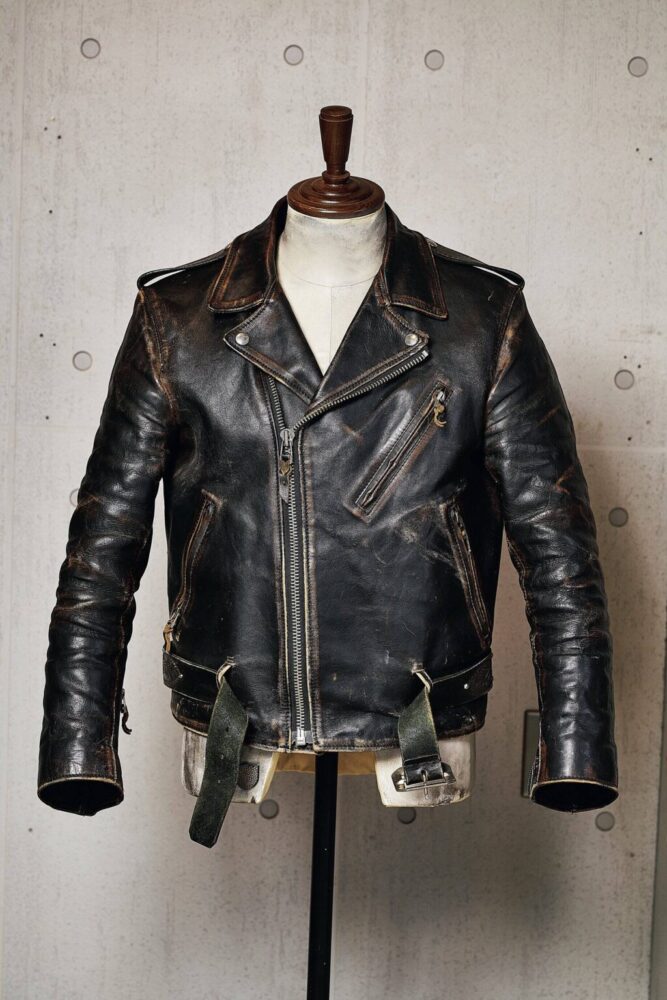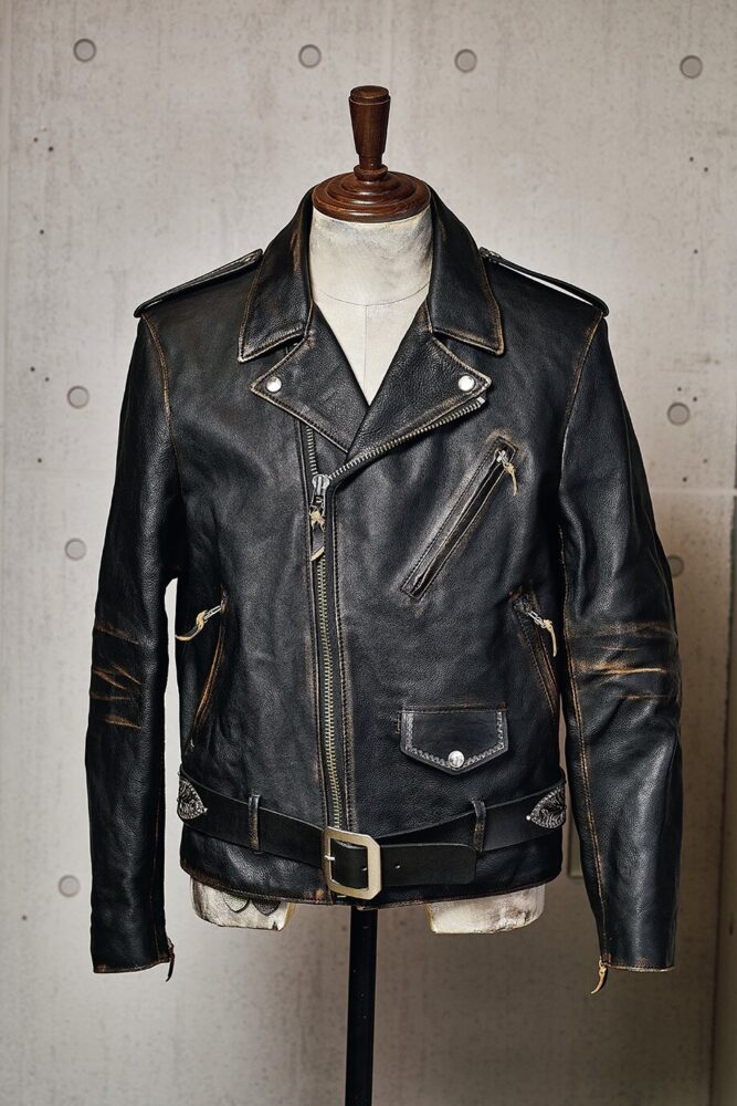 オーセンティックなダブルライダースのデザインにエイジング加工とThe Oreを施したアツレザーワークスの代表作。伝統的なスタイルを崩すことなく、手作業による独自の加工技法でオリジナリティを演出する、クラフトマンシップが宿る1着。32万1200円