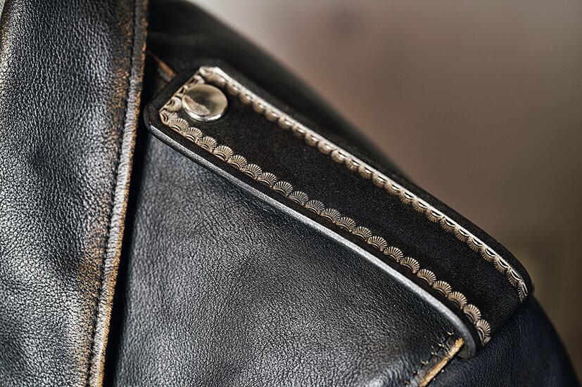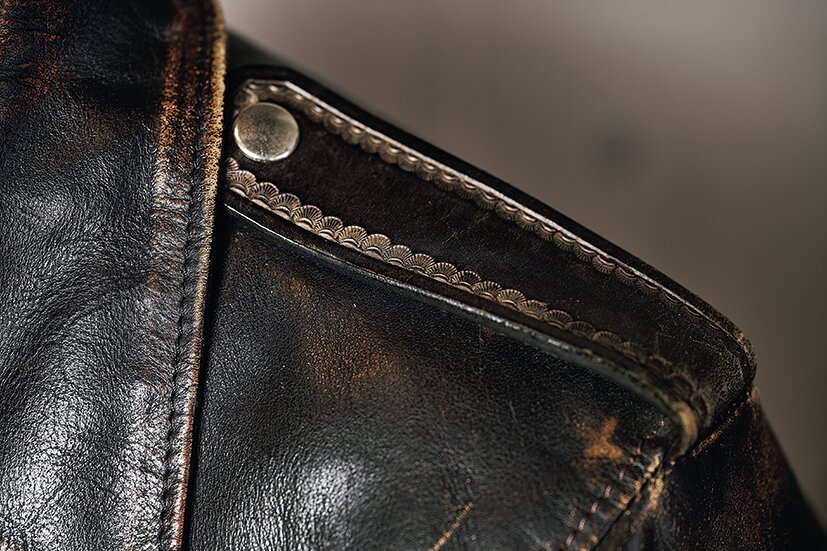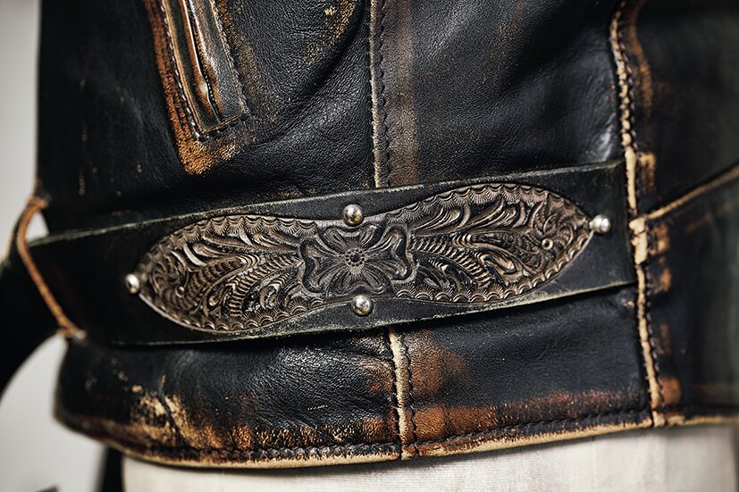 エポレットやベルトに配されるサンバーストやピーナッツのカービングがThe Oreによって浮かび上がる。着込む過程を経てレザーエイジングと同時にシルバーの色味が燻銀に変化し、渋みを増した新たな表情を見せてくれる。
