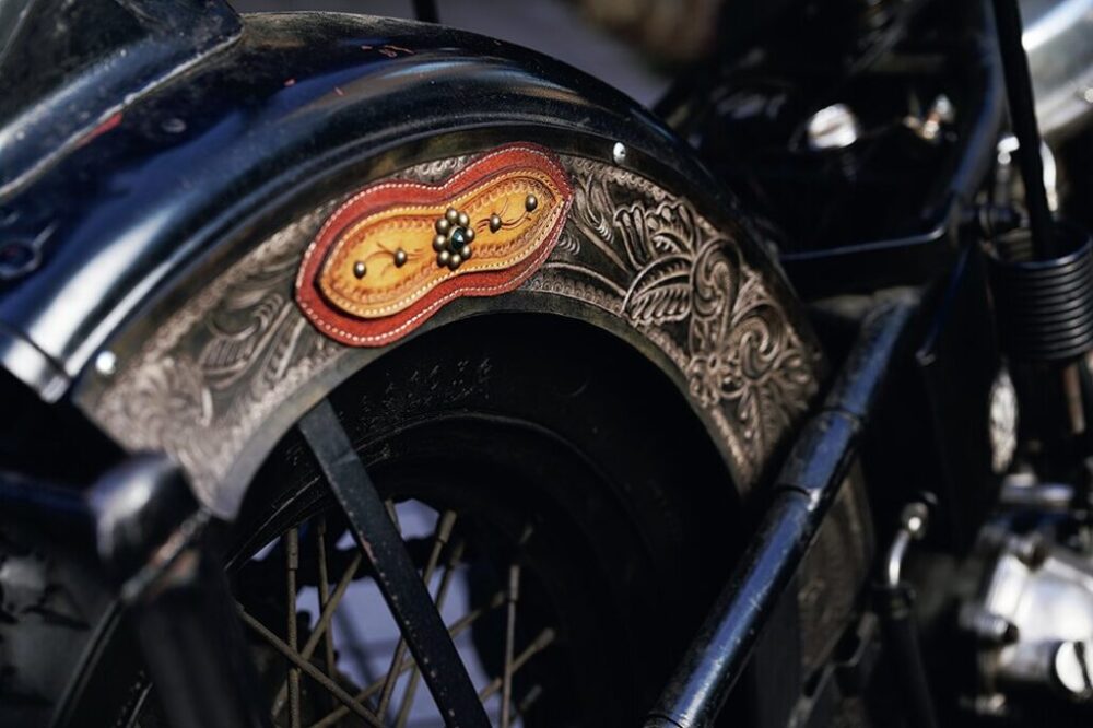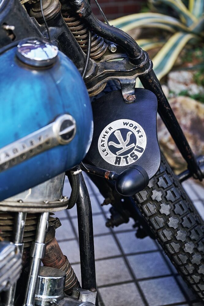 外山さんの愛車であるHDパンヘッドには、The Oreを用いたレザーアクセサリーが装備される。愛車に合わせたカスタムオーダーが可能。ストリートを走る経験値と共に育つ特別なドレスアップパーツだ。