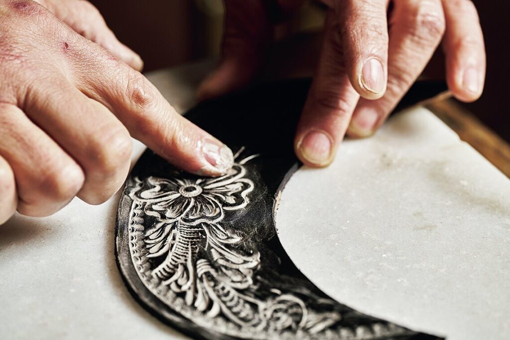 ジ・オーアはシルバーやターコイズ、ラピス、ジャスパーなど、様々な素材の色を活かした着色が可能だが、今回フィーチャーするのはシルバーを使った装飾。着用者のライフスタイルの中で、レザーの顔料が剥がれ褪色するのと同時に、粉状の純銀がカービングの上で暗灰色に近づき燻銀の輝きを静かに放つ。それは、古びていく中に美しさを見出す日本古来の美学である“侘び寂び”を表現した技術と言えるだろう。