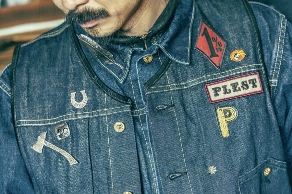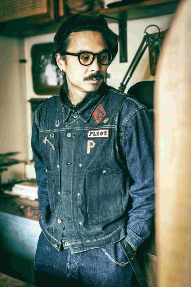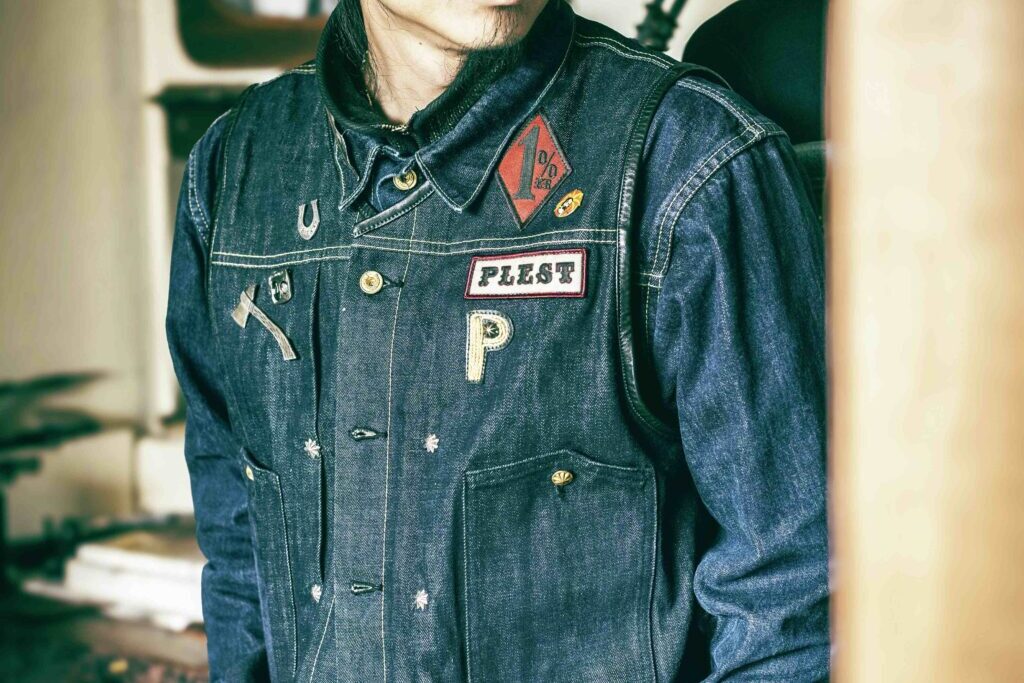 この日にオーナーの清水さんが着ていた定番の201ベスト。ボタンはすべてシルバー925で、同素材のピンズなどがセンスよくカスタムされている。エイジングもお見事である。
