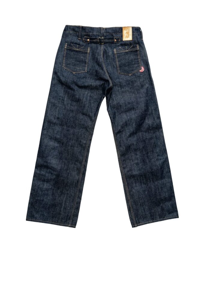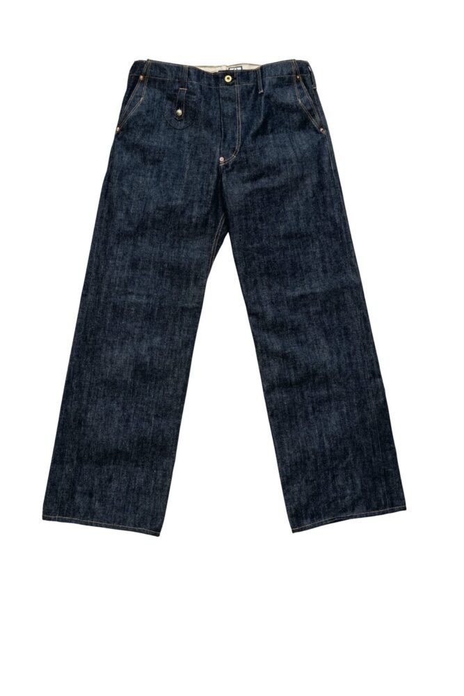1930年代以前のバックルバック付きデニムトラウザーズをイメージした定番モデル。あえて膝からまったくテーパードしない太めのストレートシルエットで、バックヨークを設けない独自の設計となっている。38,500円〜