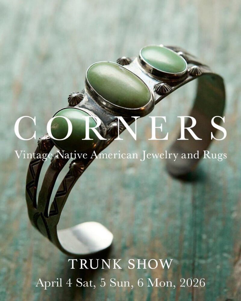 「CORNERS」はアメリカニューメキシコ州を中心に、全米より直接買い付けたネイティブアメリカンのビンテージジュエリー、ビンテージラグに加え、現代作家との共作によるオリジナルジュエリー、ラグを豊富に取り揃えている。今回のトランクショーは3日間限定の開催となる。