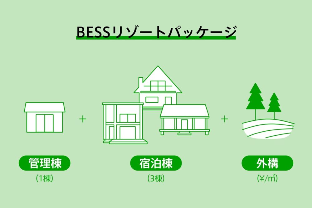 この度、BESS ARCHITECTSの第一弾パッケージ「BESSリゾートパッケージ」の販売を、リゾート事業者向けに開始する。管理棟1棟と、宿泊棟として4タイプ・34モデルの規格木造住宅の中から3棟を選んで組み合わせ、競合優位性の高い一棟貸しリゾート施設をスピーディーに開発できるパッケージである。一般的に企画から竣工まで2年以上を要するリゾート開発に比べ、最短1年、1億円で竣工まで進めることが可能である。