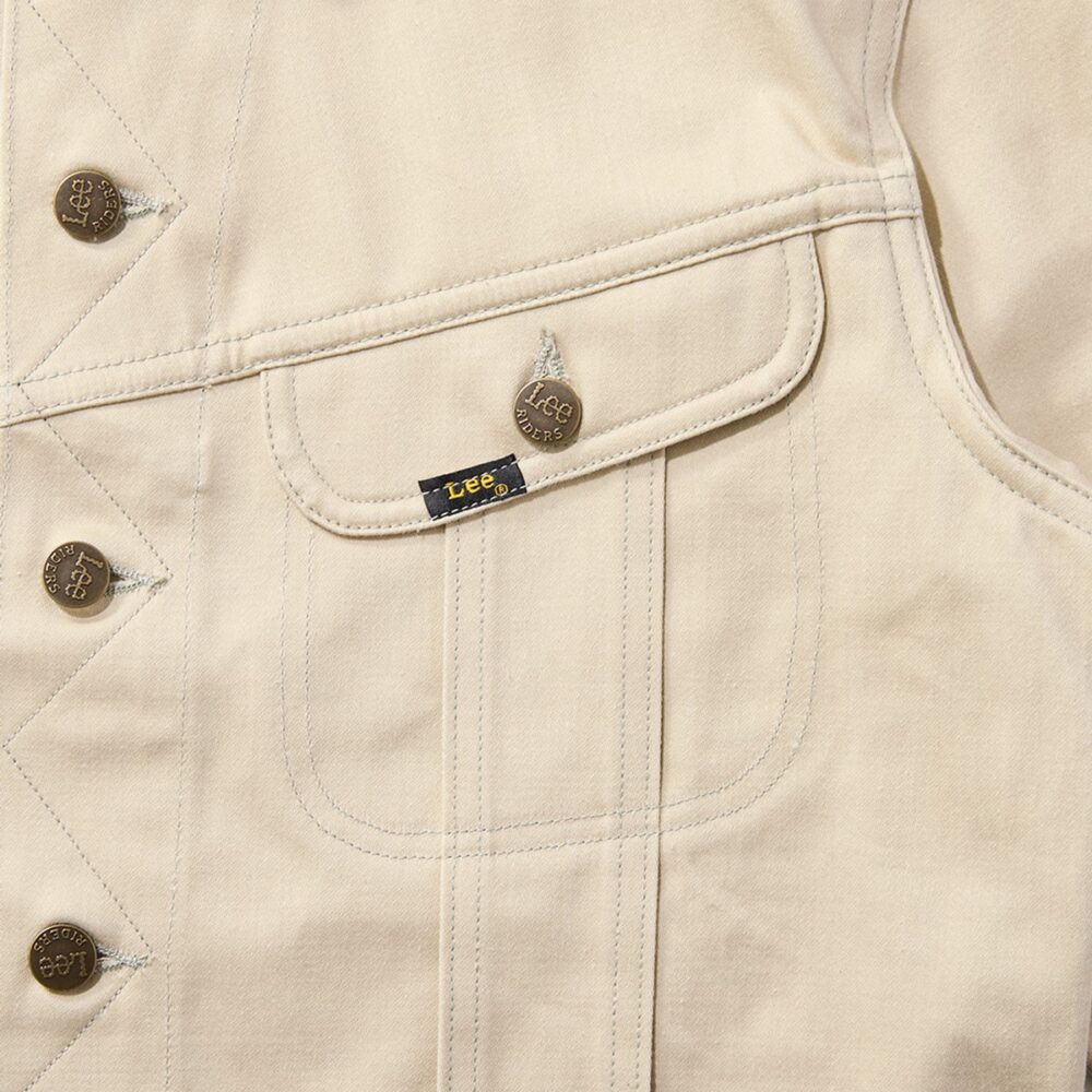 「RIDERS 101-J」を”WEST WEAVE”と呼ばれるサテン生地に置き換えた”100-J”。斜めに取り付けられたフラップ付きの胸ポケットやフロントのステッチを踏襲している。過渡期のみ見られる”Lee RIDERS”刻印のボタンと”黒タグ”が特徴的なディテールだ。