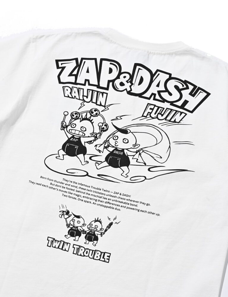 メインキャラクターは 「nataboy」。アジアの神話に登場。炎の車輪や元気な少年をイメージ。2026年新作Tシャツ、天を駆ける二人「風神 (DASH)&雷神(ZAP)」も登場!