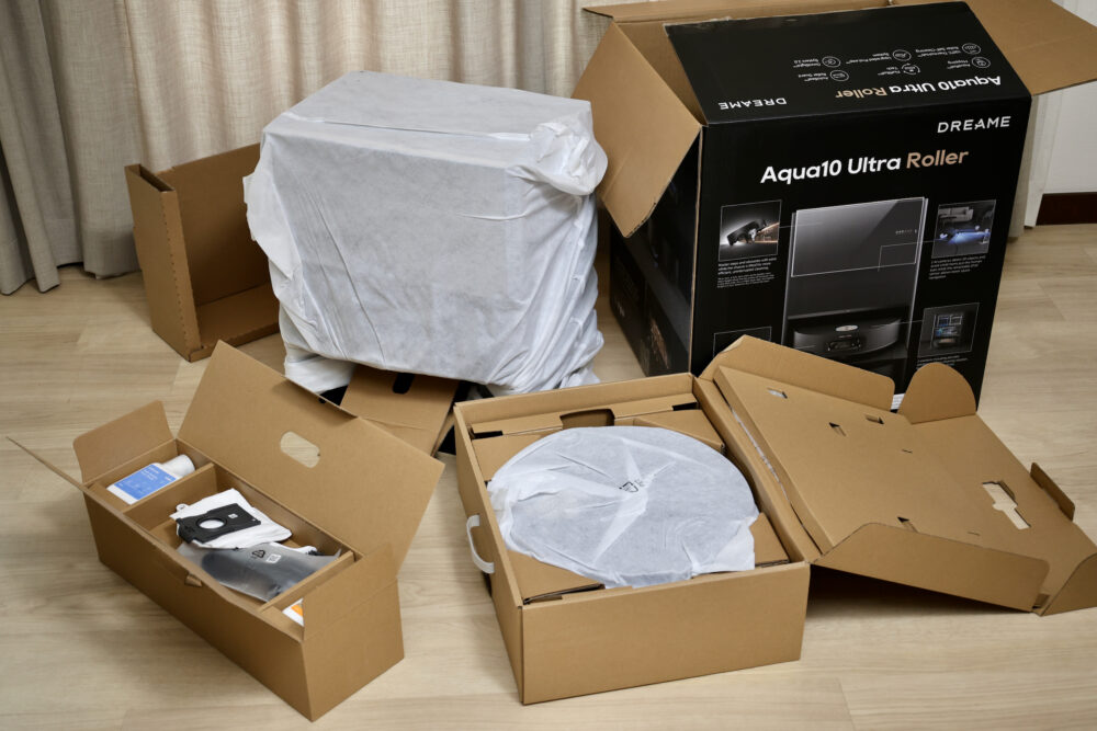 というわけで、尋常じゃなくデカい箱で届いたAqua 10 Ultra Rollerを開梱。ベースステーションも含めて、しっかりした梱包で届くので、箱が大きいというのは覚悟しておいた方がいい。定価で24万9800円という超高級機種なので、何もかもがひたすら豪華なのだろう(11月10日現在クラファンで33%オフの16万7366円)。