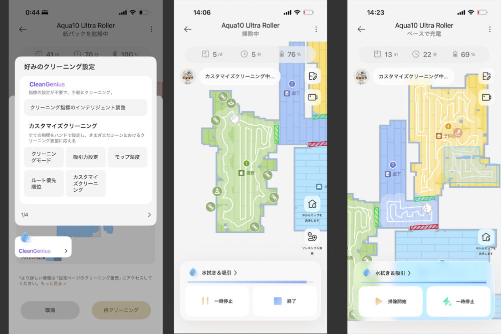 最初は1階でマッピングを実行。Dreame Aqua 10 Ultra Rollerは、LiDAR SLAM(ライダーによる同時定位と地図作成)で非常に精度の高いマッピングを行い、環境を把握する。操作は専用アプリから簡単にでき、さまざまな設定もこのアプリから行う。