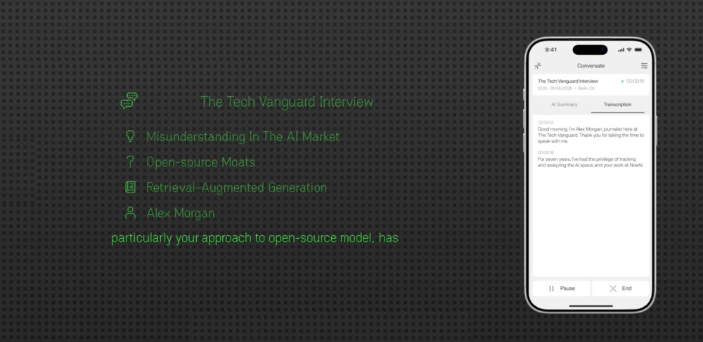 従来の、クイックノート、翻訳、ナビゲート、テレプロンプター、Even AI、インフォメーションに加えて、Conversation(会話)という機能が加わった。これは冒頭で利用例をご紹介したような、会話を記録、サマリしつつ、情報などをサポートしてくれるアプリ。かなり実用性は高いと感じた。