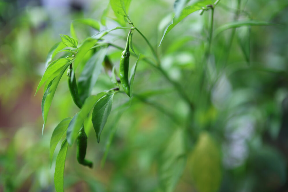庭のシシトウ。葉の間から実を探して収穫する。最初は見分けがつかないのだが、慣れてくるとこんな感じで実だけが見えるようになる。