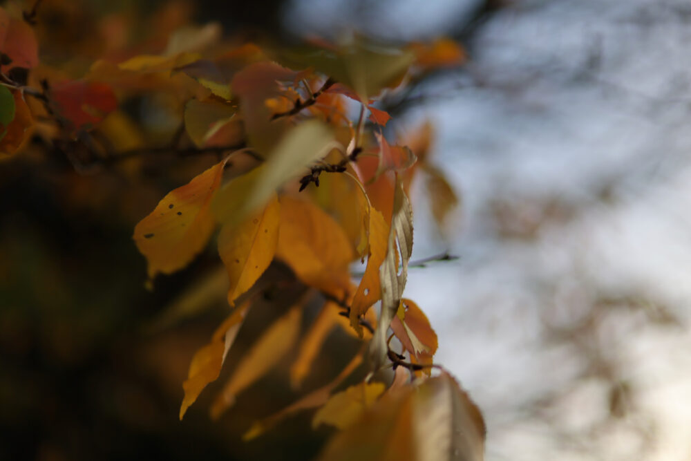 歩いているうちに日が暮れ始めた。秋の桜の葉を。合焦したところの前後のボケが楽しくて、ついつい開放で撮ってしまう。