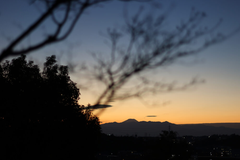 遠くに見えた富士山を。手前の葉の落ちた桜の枝をボカしつつ。