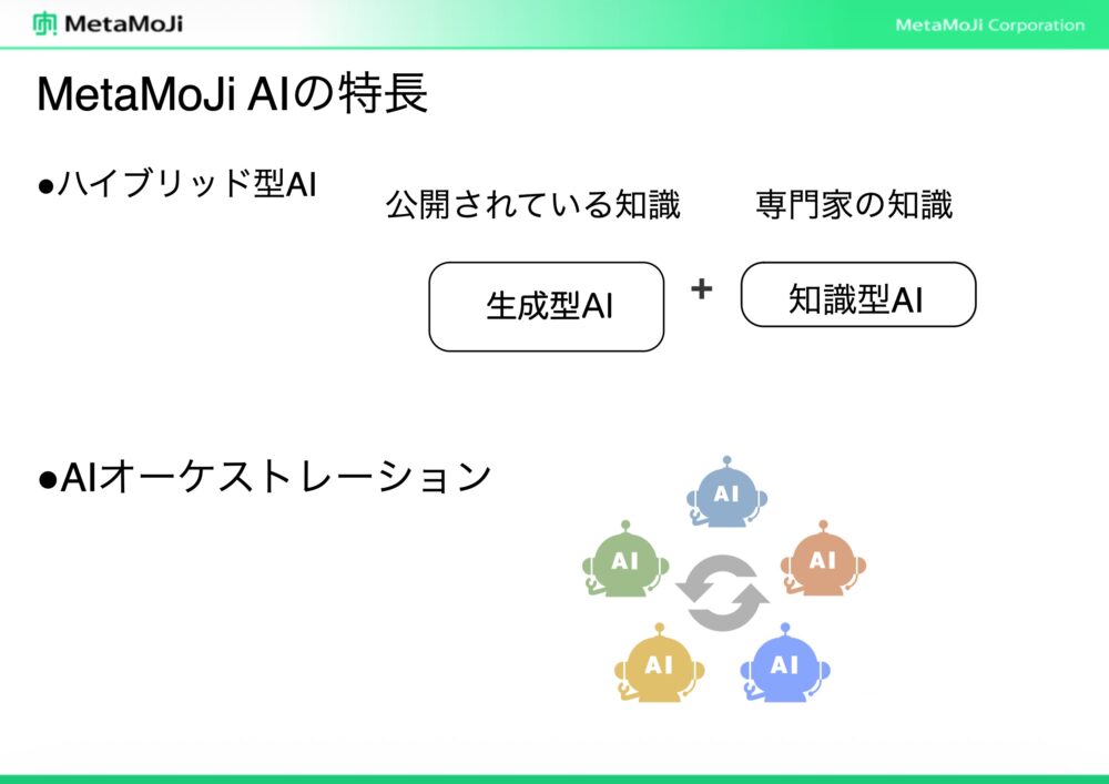 その上で、今回のMetaMoJiは『複数のAIを協力させるAIオーケストレーション』、『ハルシネーションを発生させない生成型AIと知識型AIのハイブリッド型AI』となっているのが大きな特徴だ。