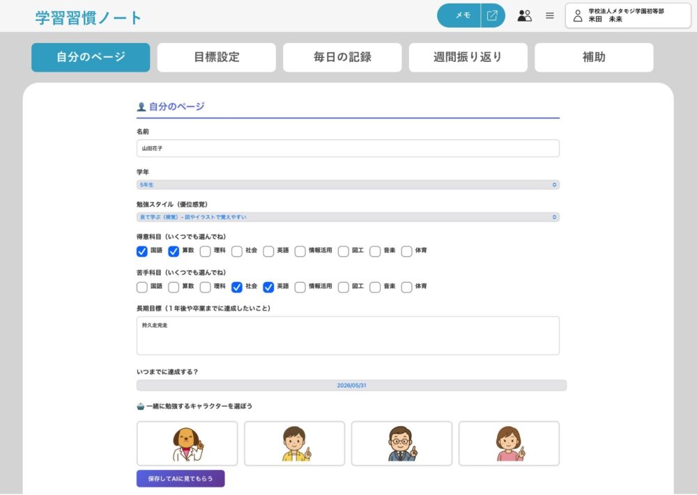 『習慣ノート』2026年4月からを目処にMetaMoJi ClassRoom 3に搭載がスタートする予定で、具体的目標の達成と、実行して記録、振り返って改善……という流れをサポートする。これにはMetaMoJi独自のAI(後述)がサポートしてくれるという。小学生用の目標達成ノートはMetaMoJi ClassRoom 3に付属する。