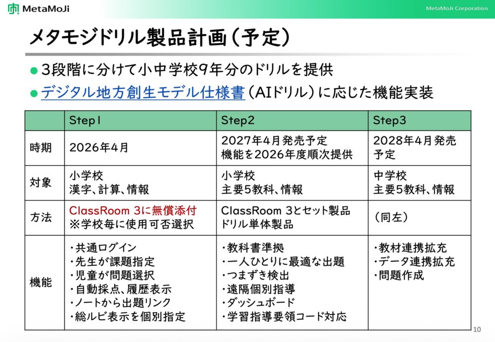 次に、2024年10月にローンチされたMetaMoJi ClassRoom 3に、2026年4月から『メタモジドリル』『習慣ノート』が搭載されるということ。『考える力ノート』の小学生向け一部機能もこの段階で搭載される。