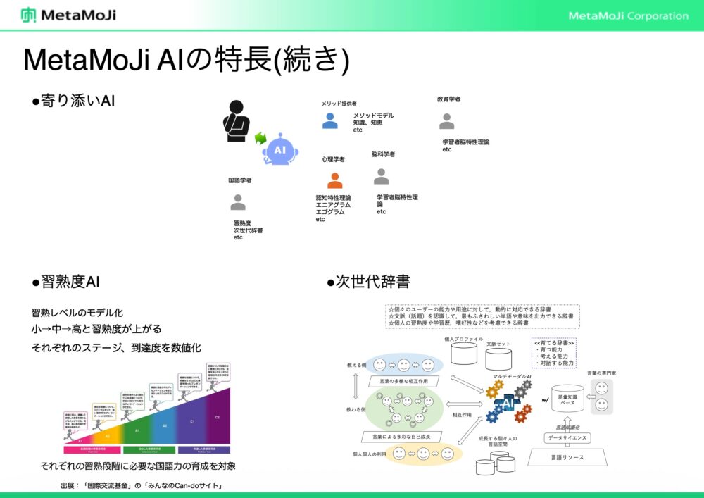 まず、MetaMoJiは、『MetaMoJi AI』 という、確かな学習に使えるハルシネーションのないAI技術を開発中だということ。