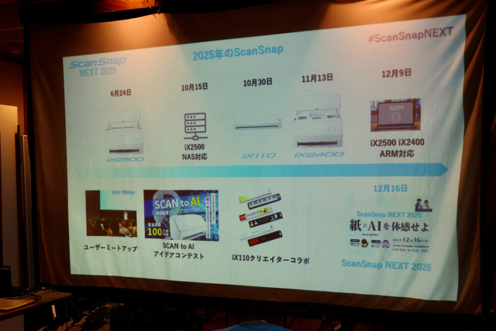 PFUの平井将也部長のプレゼンテーションでは、今年発売された新製品、追加された新機能、大きなイベントなどが解説された。ScanSnapとしては、非常にアップデートが多かった一年であることが分かる。