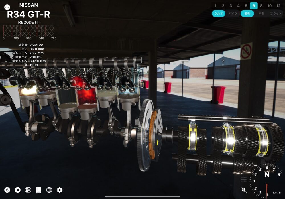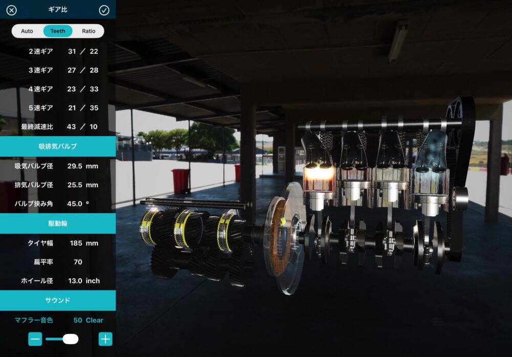 エンジンの回転数は、回転計を指で操作するか、iPad/iPhoneを傾けることで、スロットル操作をすることで操作することができる。ギアもギアパネルでタップすることで操作できる。すると、そのエンジンの回転数に応じて、それなりにその車種っぽい音がするのだ。