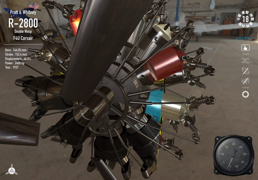 こちらは1列9気筒を複列備えた18気筒。2400馬力だから重装甲の機体を飛ばすことができる。ゼロ戦の1300馬力がいかにも非力に思える。つらいところだ。
