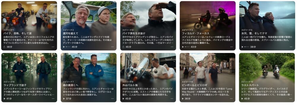ご存じスター・ウォーズでオビ=ワン・ケノービを演じたユアン・マクレガーと、その大親友の俳優チャーリー・ブアマンの半プラべートなバイクツーリングを描いたドキュメンタリーが『LONG WAY』シリーズだ。すべてApple TVで、見ることができる。