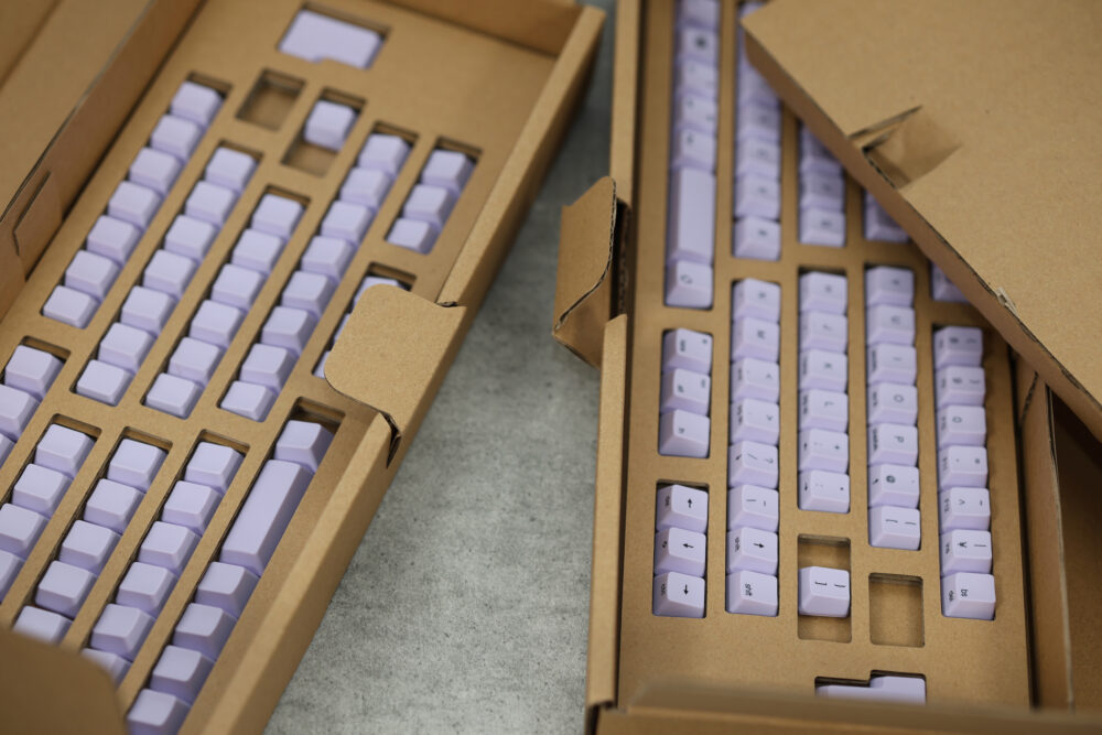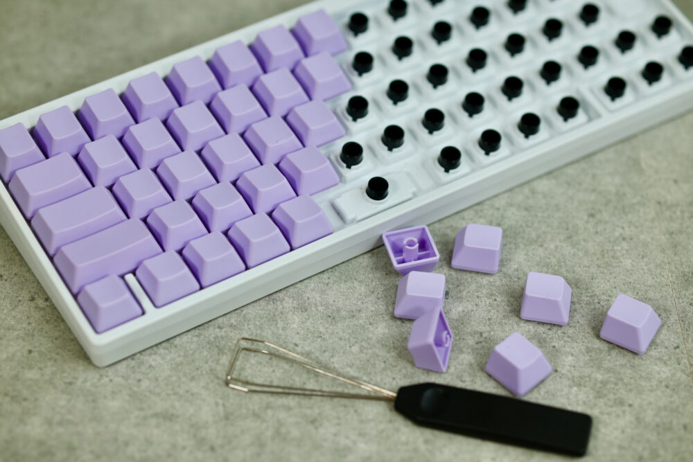 キートップは、付属のツールを使って、差し換える。刻印ありの場合は個々の位置が間違えられないのはもちろんだが、無刻印の場合は段ごとに形状が違うので、各段が混ざらないようにしたい。また、3段目の『F』と『 J』のキーには、小さな突起があるから、その位置も間違えないように。