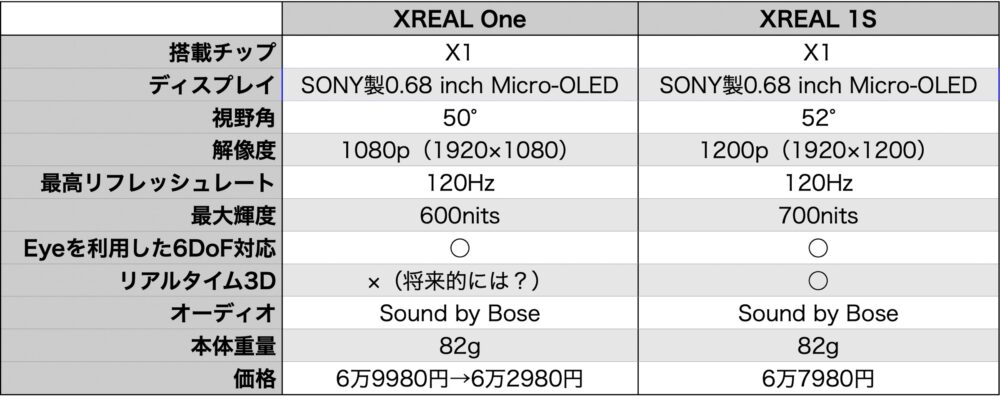 次々と新商品をリリースするXREAL。どの商品が上位ということなく続々と登場するので、どれを買ったらいいか迷う人も多いと思う。少し旧型になるAirシリーズはともかく、最新でもOne、One Proと出た直後に、1Sが登場たものだから、悩む人も多いだろう。