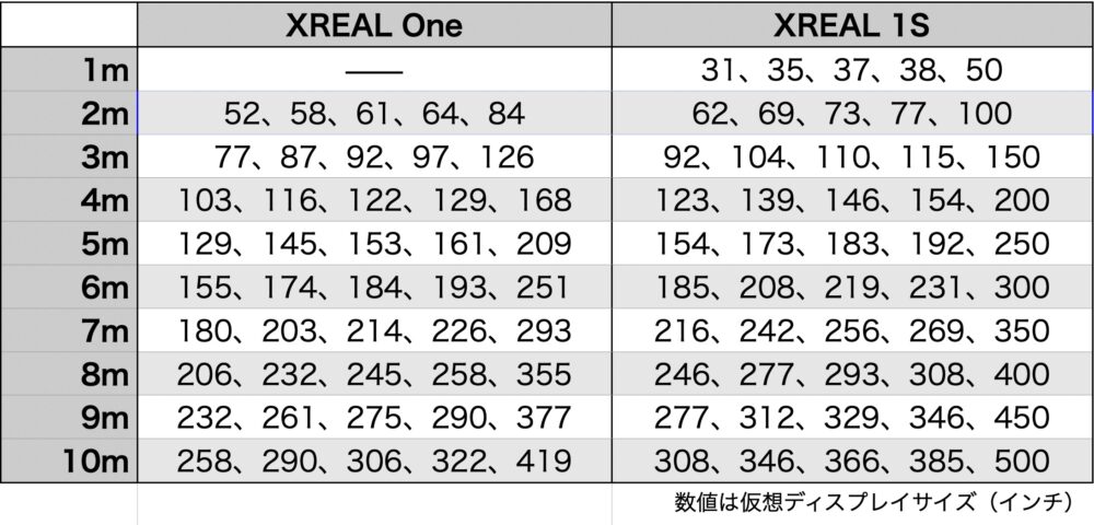 特に、筆者は距離を1mにした時の50インチ表示が良いと感じた。つまり、デスクの上に大型ディスプレイを置いている感覚だ。この表示サイズが興味深かったので、全部数値を表示して、表にしてみた(手作業でプチプチと調べたので間違いがあるかもしれない……)。