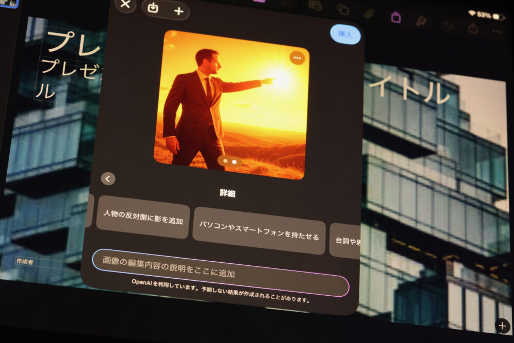 アップルのKeynote、Pages、Numbers、フリーボードについては、生成AIが使えるのが便利ポイント。世の中全体のことを考えると「やっと搭載」という気もしないではないが、Keynoteのスライドを作りながら、必要な画像をその場で生成できるのはやはり便利。