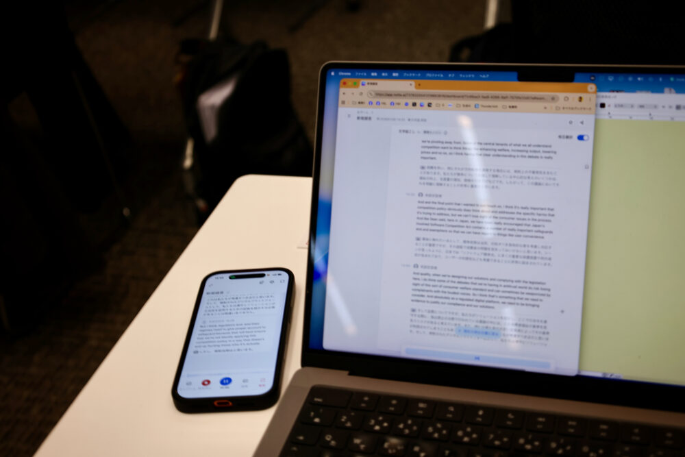 スマホ側で録音しているものを、同時にパソコンで見ることもできる。翻訳もしてくれるから、多国語の取材にはとても便利だ。というか、筆者は英語が不得手だから、この機能には非常に助けられている。