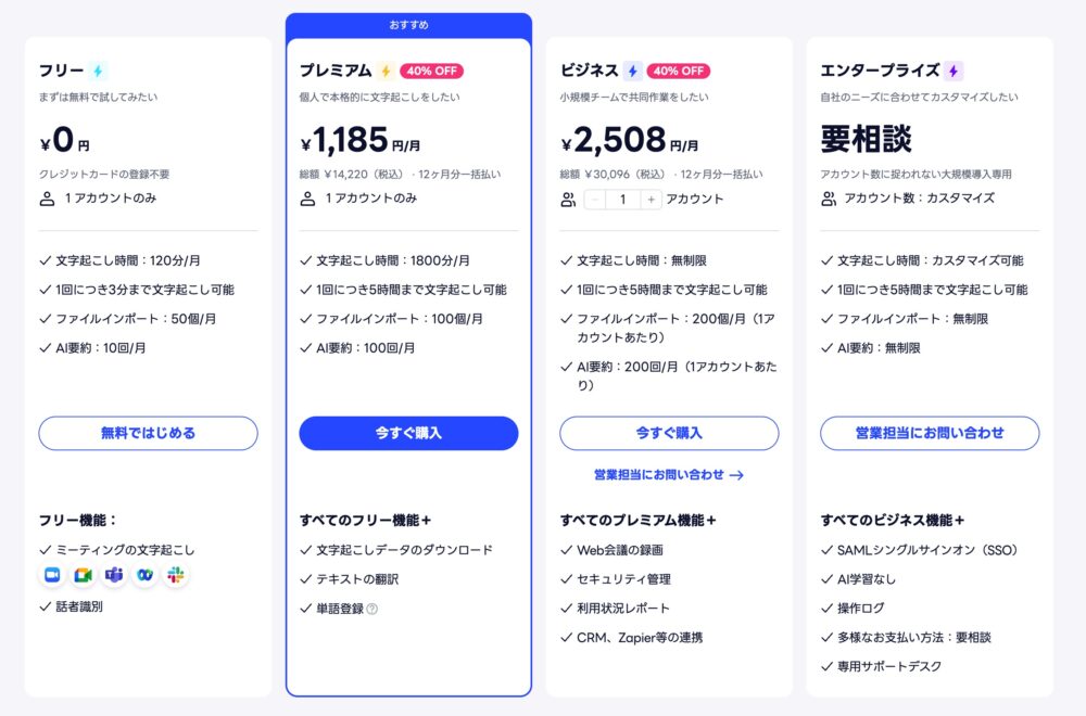 大きな文字で表示されているのは、年額課金で40%オフになっているので、月額ならプレミアムが1980円、ビジネスが4180円。本格的に使うなら、年額課金が圧倒的にお得だ。