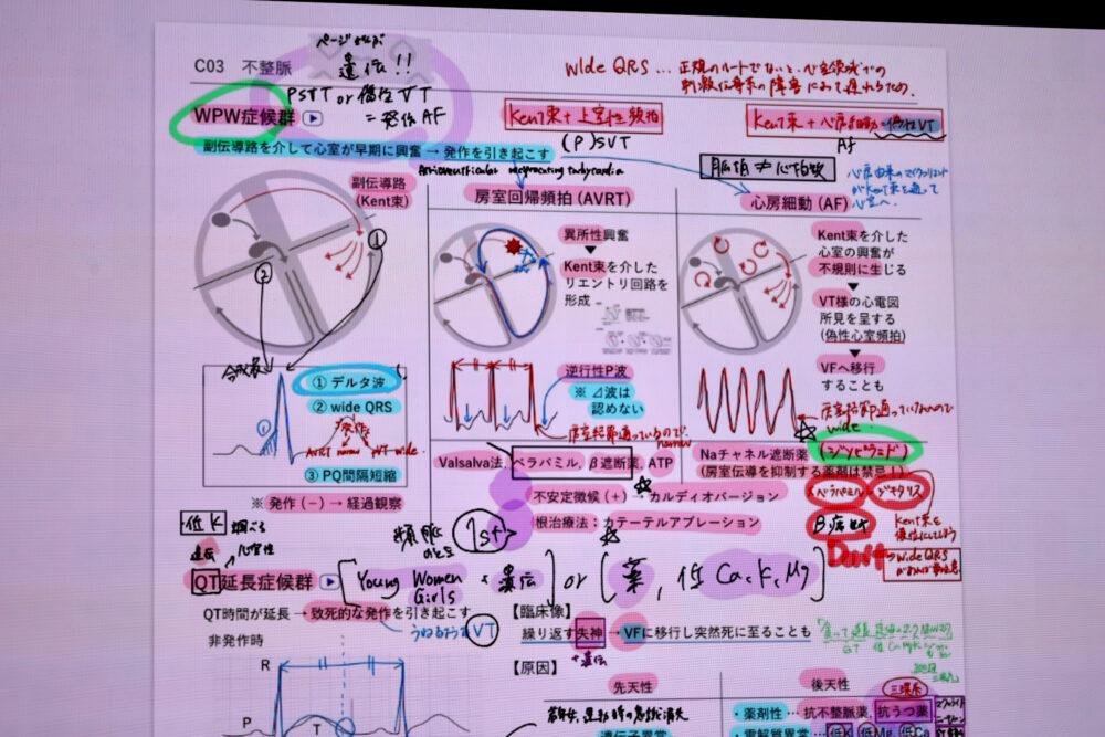 また、マーカーの色分けについても明確なルールを設けている。色は見た目の派手さではなく、自分の心理にフィットするものを選ぶことが重要だという。たとえば、数値が増える内容には『赤』、減る内容には『青』といった具合に意味づけを行い、視覚的にも整理された状態をつくる。たとえば、心臓にまつわる話には赤、空気に関係する肺の話なら青という具合だ。このように色に意味を持たせることで、記憶への定着を促し、後から見返したときにも直感的に内容を思い出せる構造をつくっているのである。