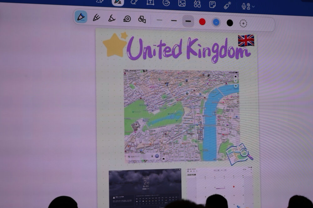 実践ワークでは、海外留学の経験が豊富なあおいさんの思いが反映された課題が提示された。多くの人に海外を体験してほしいという願いから、まず行ってみたい海外の国や街をノートのタイトルとして、地図や現地の天気、カレンダーの画面キャプチャを貼り付け、その上から直接書き込みを行うという内容である。